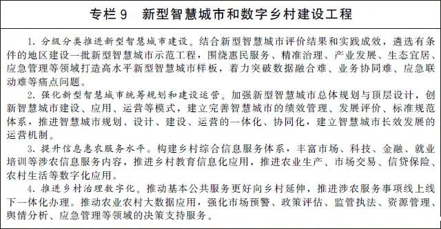 (三)推动数字城乡融合发展。统筹推动新型智慧城市和数字乡村建设,协同优化城乡公共服务。深化新型智慧城市建设,推动城市数据整合共享和业务协同,提升城市综合管理服务能力,完善城市信息模型平台和运行管理服务平台,因地制宜构建数字孪生城市。加快城市智能设施向乡村延伸覆盖,完善农村地区信息化服务供给,推进城乡要素双向自由流动,合理配置公共资源,形成以城带乡、共建共享的数字城乡融合发展格局。构建城乡常住人口动态统计发布机制,利用数字化手段助力提升城乡基本公共服务水平。