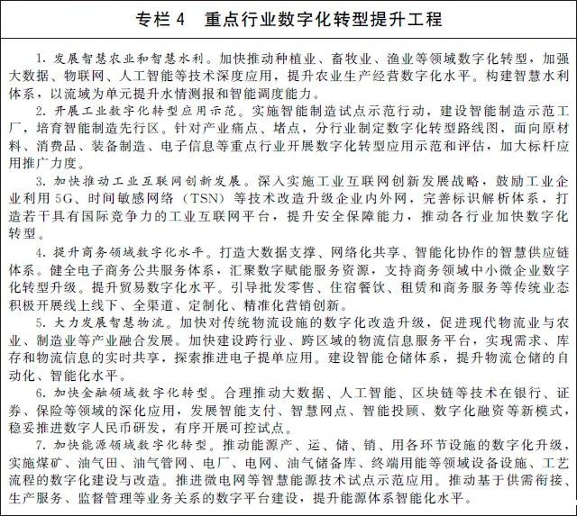 (二)全面深化重点产业数字化转型。立足不同产业特点和差异化需求,推动传统产业全方位、全链条数字化转型,提高全要素生产率。大力提升农业数字化水平,推进“三农”综合信息服务,创新发展智慧农业,提升农业生产、加工、销售、物流等各环节数字化水平。纵深推进工业数字化转型,加快推动研发设计、生产制造、经营管理、市场服务等全生命周期数字化转型,加快培育一批“专精特新”中小企业和制造业单项冠军企业。深入实施智能制造工程,大力推动装备数字化,开展智能制造试点示范专项行动,完善国家智能制造标准体系。培育推广个性化定制、网络化协同等新模式。大力发展数字商务,全面加快商贸、物流、金融等服务业数字化转型,优化管理体系和服务模式,提高服务业的品质与效益。促进数字技术在全过程工程咨询领域的深度应用,引领咨询服务和工程建设模式转型升级。加快推动智慧能源建设应用,促进能源生产、运输、消费等各环节智能化升级,推动能源行业低碳转型。加快推进国土空间基础信息平台建设应用。推动产业互联网融通应用,培育供应链金融、服务型制造等融通发展模式,以数字技术促进产业融合发展。
