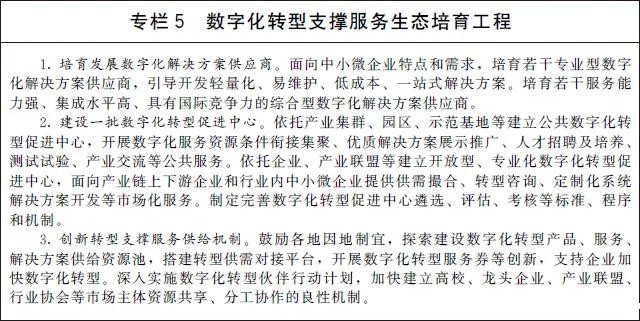 (四)培育转型支撑服务生态。建立市场化服务与公共服务双轮驱动,技术、资本、人才、数据等多要素支撑的数字化转型服务生态,解决企业“不会转”、“不能转”、“不敢转”的难题。面向重点行业和企业转型需求,培育推广一批数字化解决方案。聚焦转型咨询、标准制定、测试评估等方向,培育一批第三方专业化服务机构,提升数字化转型服务市场规模和活力。支持高校、龙头企业、行业协会等加强协同,建设综合测试验证环境,加强产业共性解决方案供给。建设数字化转型促进中心,衔接集聚各类资源条件,提供数字化转型公共服务,打造区域产业数字化创新综合体,带动传统产业数字化转型。
