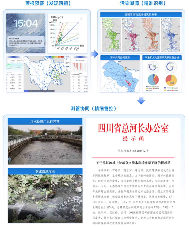 二是实现河湖治理精准监管能力提升,支撑四川省各级地表水环境管理部门开展流域地表水环境监测管理、资源调配和污染管控。