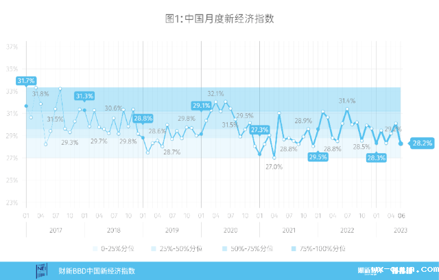 2023年6月,财新BBD中国新经济指数(NEI)录得28.2,较前月下降1.9个百分点