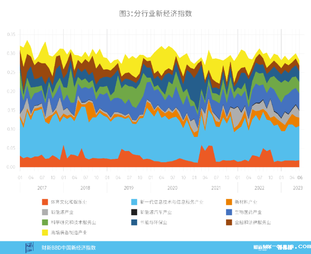 2023年6月,新一代信息技术与信息服务产业为总指数贡献了9.1个百分点,新能源产业占比下降了1.3个百分点