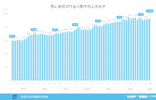 2023年6月,新经济行业入职平均工资水平为每月13755元,新经济入职工资“溢价”为5.1%