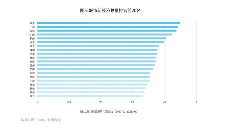 过去半年中,新经济总量排名前五的城市分别为北京、上海、深圳、广州和杭州