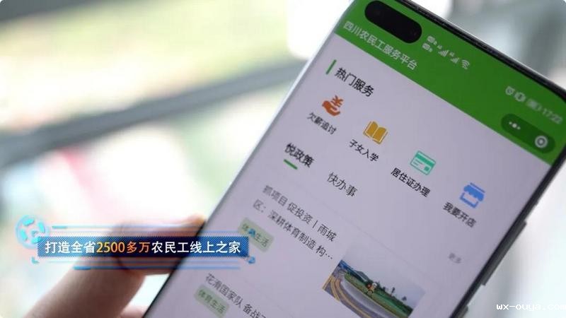 2019年8月1日,“四川农民工服务平台”正式上线。平台具备了信息服务、在线办事、互动交流三大功能,开发了网站、手机客户端、微信小程序三种服务形式,致力于为全省2500万农民工量身打造一个专业化、精准化、人性化的服务平台,让农民工在平台上找到家的感觉。