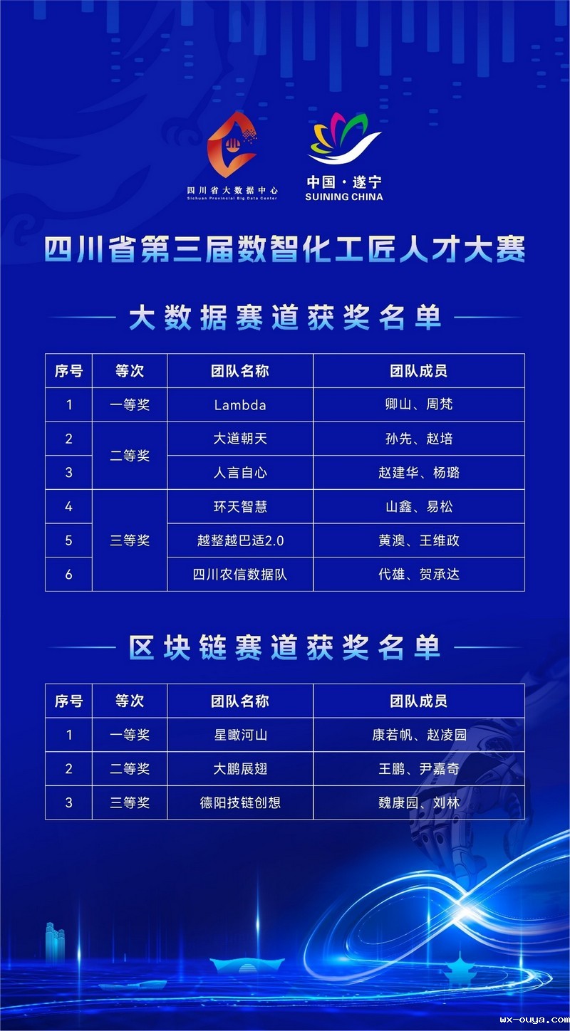 经过激烈比拼,大数据赛道决出一等奖1名、二等奖2名、三等奖3名,区块链赛道决出一二三等奖各1名。符合条件的一等奖获奖选手,还将被授予“四川省技术能手”称号。获奖名单如下: